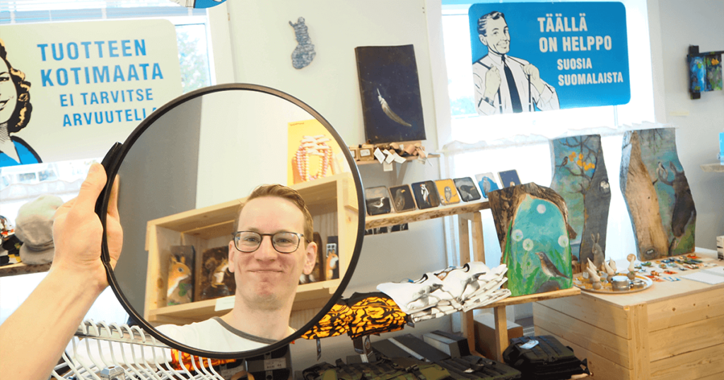 Yksi hyvin yleinen positiivinen yllätys, joka ensikertaa myymäläämme saapuvalle tulee, on että Suomessa valmistetaan sittenkin vielä paljon kaikenlaista. ”Kun tuntuu siltä, että kaikki siirtyy ulkomaille.”