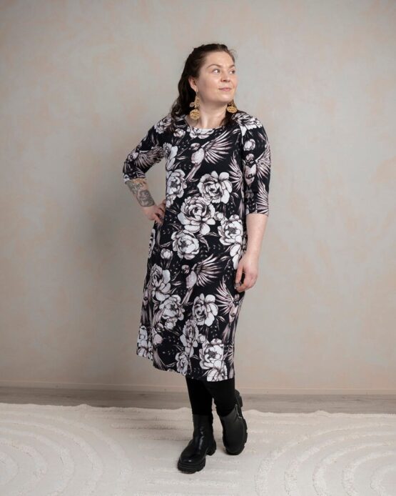Tyylikรคs ja hyvรคn mallinen mekko ihanalla Serenity kuosilla. Sopii moneen menoon๐