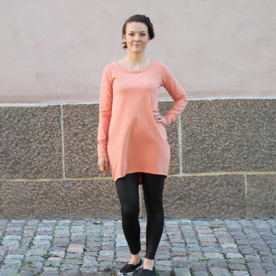 Pallohelmainen Kanto Design Soma tunika persikka korostaa kivasti muotoja luoden naisellista tyyliä. Tunikan helma on edestä hieman lyhyempi kuin takaa, mikä antaa vaatteelle mukavaa keveyttä.