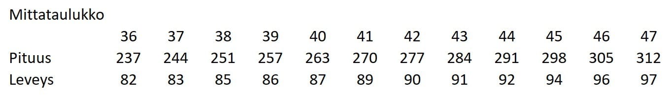 Lämpimät talvikengät hyvin pitävällä pohjalla. Kuoman pohjaa on kehuttu ja nyt olen sen itse hyväksi todennut. Helsingissä ei ole tarpeeksi lunta nastakenkiin tänä vuonna. Leveä lesti ja reilu mitoitus. Mitoitus niin reilu, että käytössä olen todennut että yhtä pienempi koko olisi riittänyt. Omat tukipohjalliset kun ovat 40 niin en uskaltanut pienempiä tilata. Tuplapohjalliset ja nauhat auttavat koon säätöön. Todella nopea toimitus.