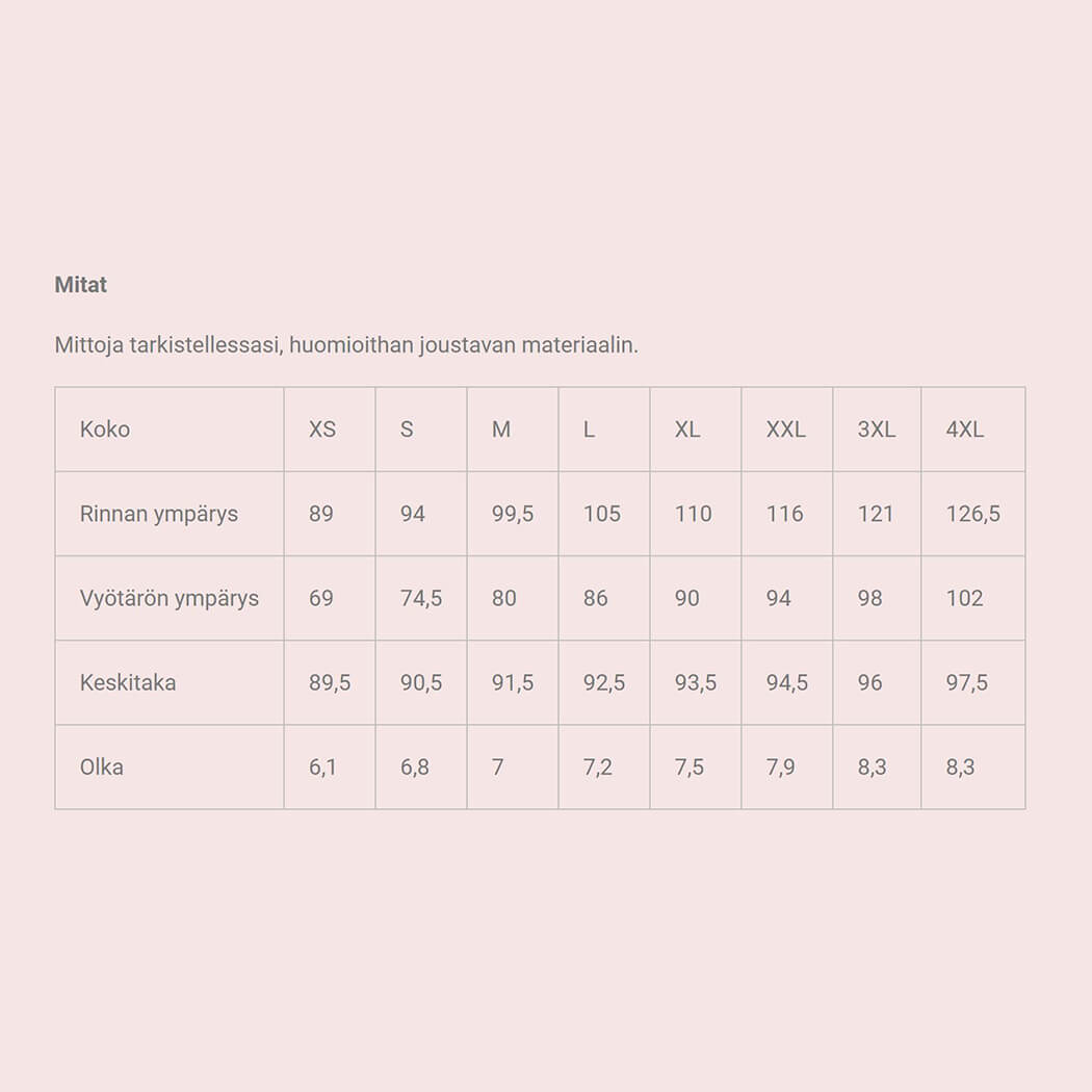 Mekko on suunniteltu suomalaisen naisen mitoituksella. Konepesu hienopesuohjelmalla, ei huuhteluainetta. Ripustetaan henkariin kuivumaan.