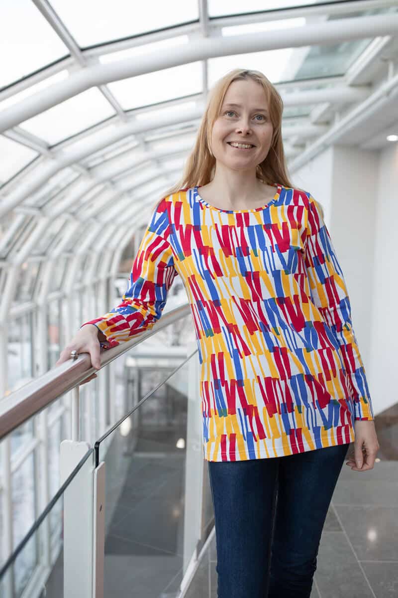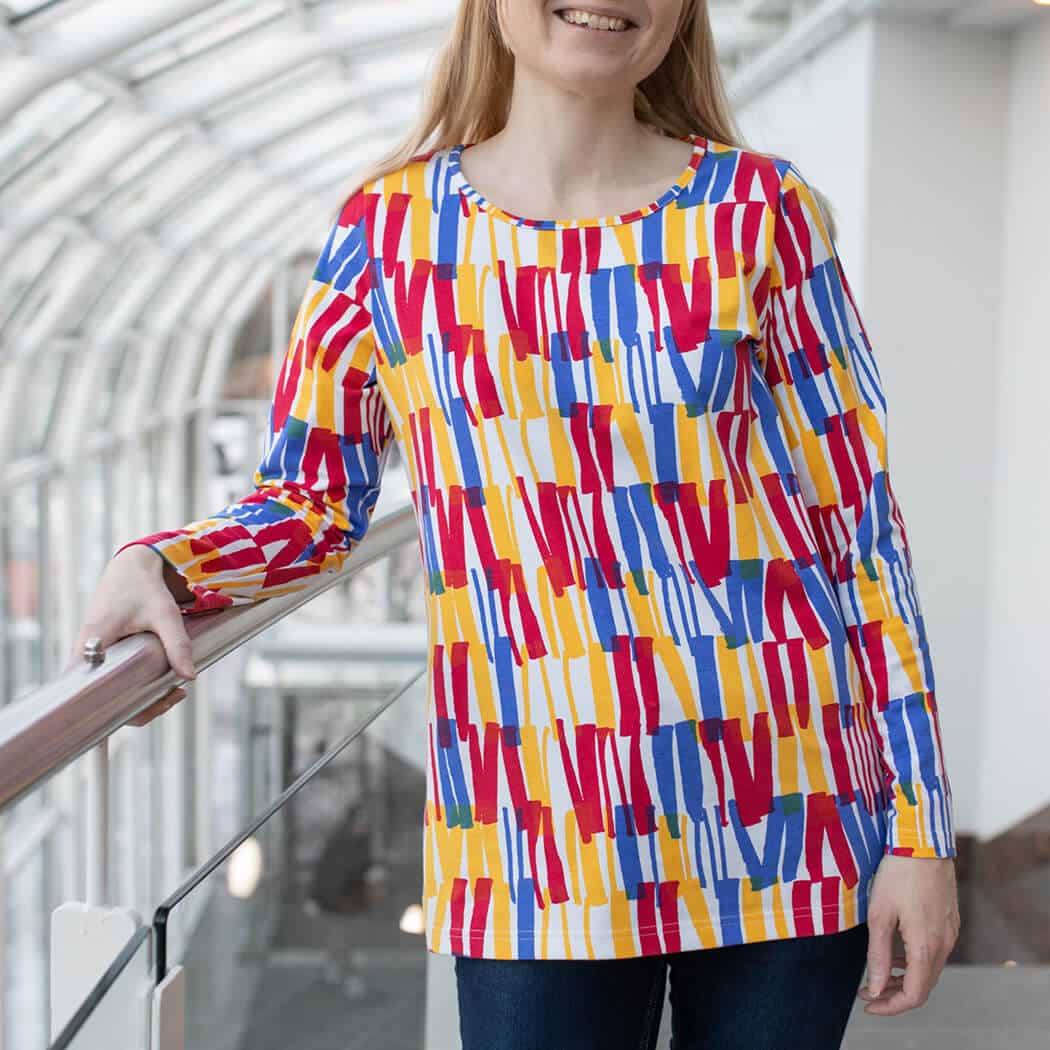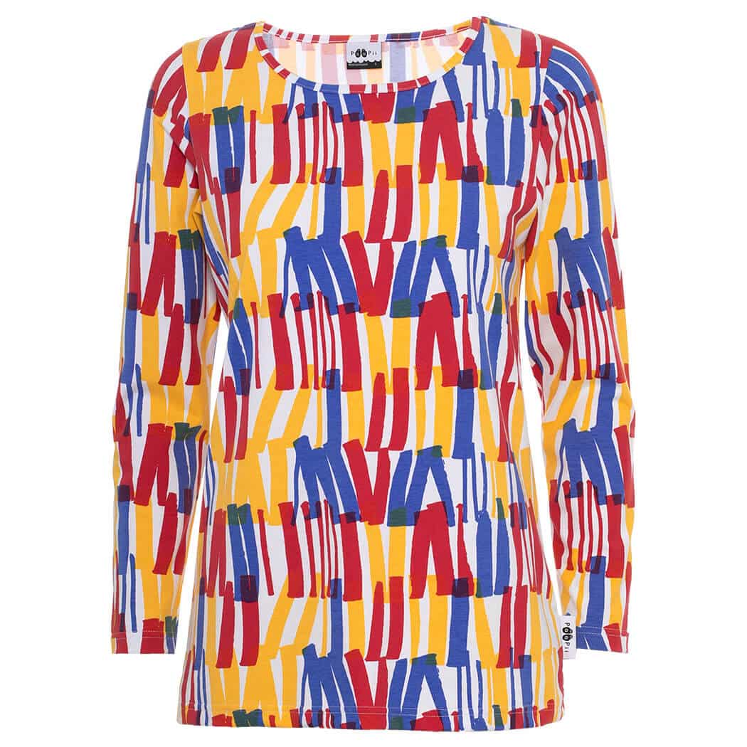 PaaPii Design Aava paita Kirjasto punainen-sininen-aurinko on mukava pitkähihainen paita, jonka kauniit värit suorastaan hehkuvat. Hauska Kirjasto-kuosi muistuttaa, että lukemattomat seikkailut ovat aivan nurkan takana.