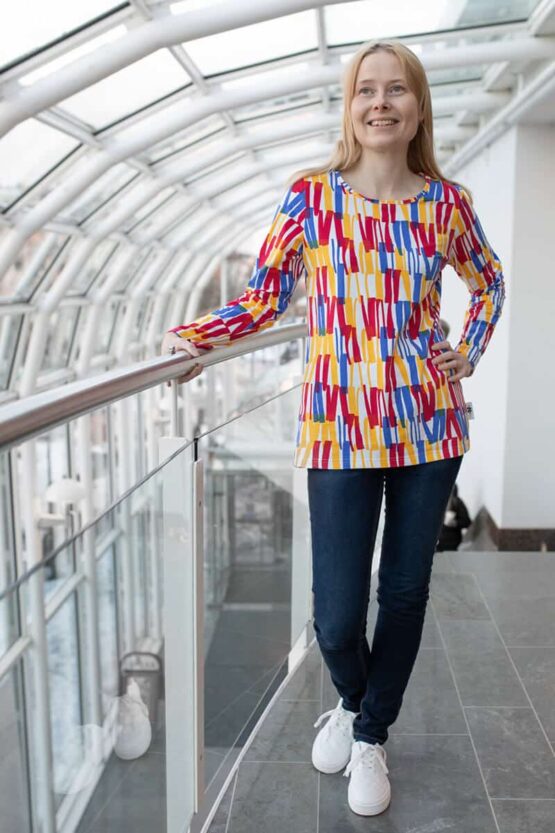 PaaPii Design Aava paita Kirjasto punainen-sininen-aurinko on mukava pitkรคhihainen paita, jonka kauniit vรคrit suorastaan hehkuvat. Hauska Kirjasto-kuosi muistuttaa, ettรค lukemattomat seikkailut ovat aivan nurkan takana.