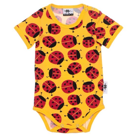 PaaPii Design kesäbody Kerttu aurinko-punainen on todella suloinen pienen elämään tutustujan kesävaate. Iloisen keltaisella kankaalla tepastelevat leppäkertut tuovat viestiä kesän riemusta. Lyhythihainen kesäbody sopii elämän ensimmäisiin suuriin seikkailuihin.