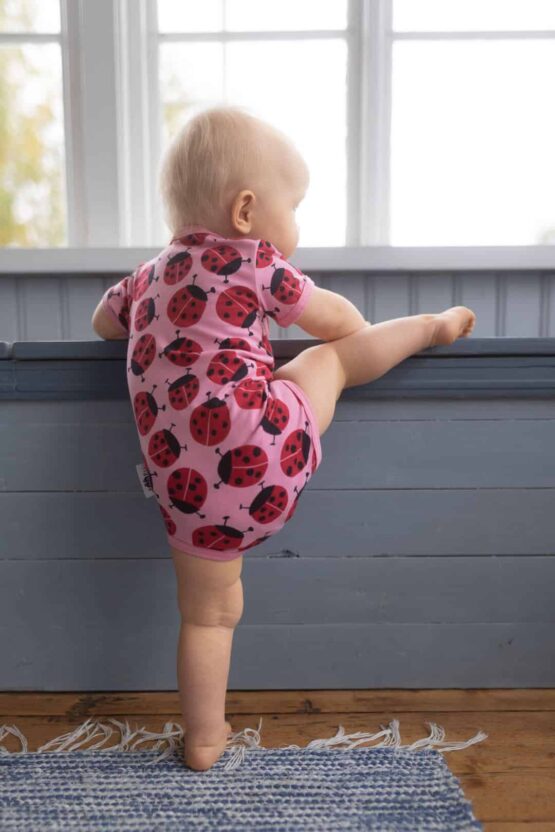 PaaPii Design kesäbody Kerttu vaaleanpunainen-punainen on todella suloinen pienen ihmisen kesävaate. Kauniin vaaleanpunaisella kankaalla tepastelevat leppäkertut tuovat viestiä kesän riemusta. Lyhythihainen kesäbody sopii elämän ensimmäisiin suuriin kesäseikkailuihin.