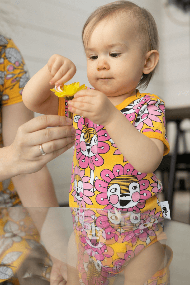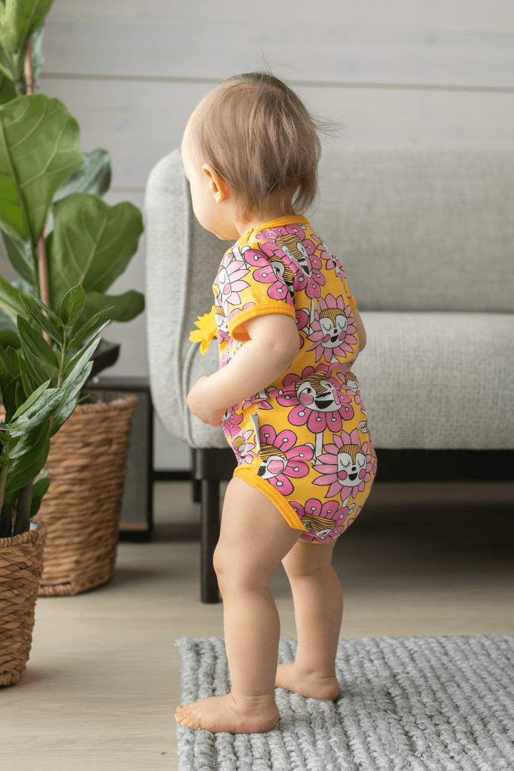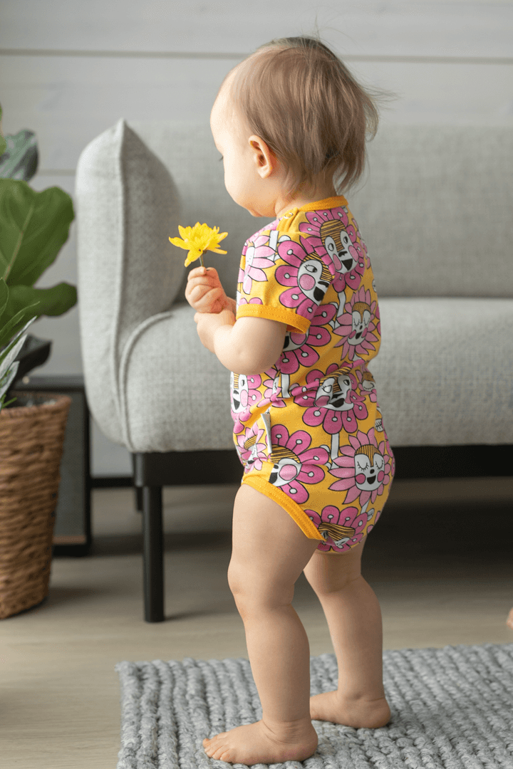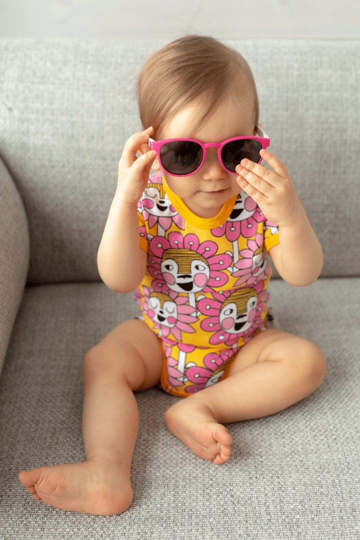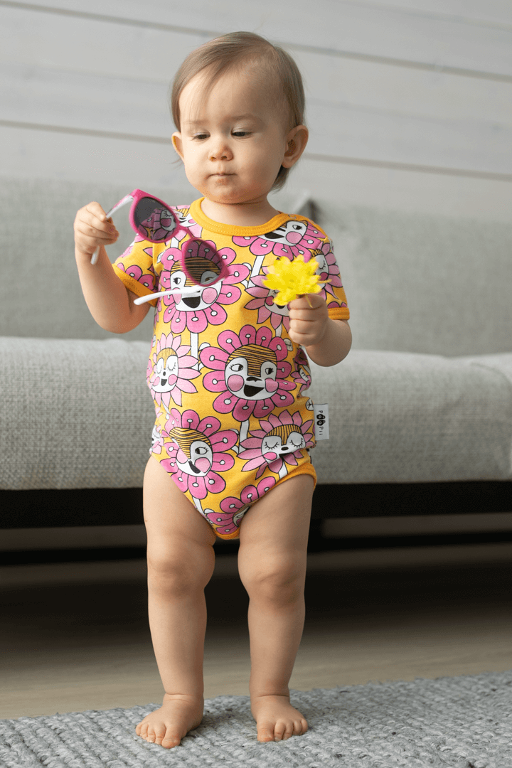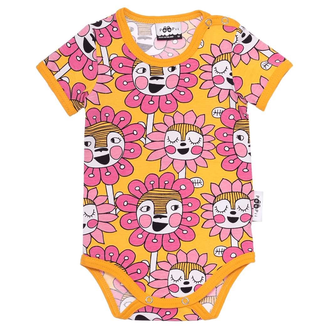 PaaPii Design Kesäbody Kukkakansa aurinko-pinkki-vaaleanpunainen on pirtsakan iloinen kirkkaan värinen kesävaate. Iloinen body vie keskelle hyväntuulista kukkakansaa. Kuka on valmiina seikkailuun? Lyhythihaisen bodyn kauluksessa on kätevät napit, jotka helpottavat vauhdikkaammankin pikku ihmisen pukemista.