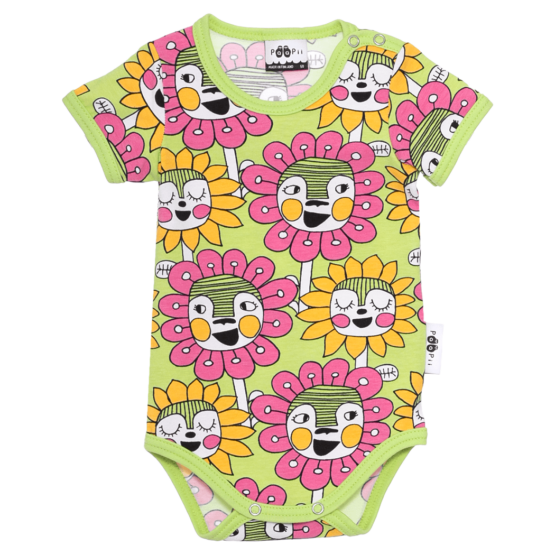 PaaPii Design Kesäbody Kukkakansa omena-pinkki-aurinko on kauniin värinen ja pirteän hauska kesävaate. Lyhythihaisessa bodyssa on naureskelevia isoja kukkia, jotka saavat myös käyttäjänsä tirskahtelemaan naurusta. Bodyn kauluksessa on kätevät napit jotka helpottavat pukemista.
