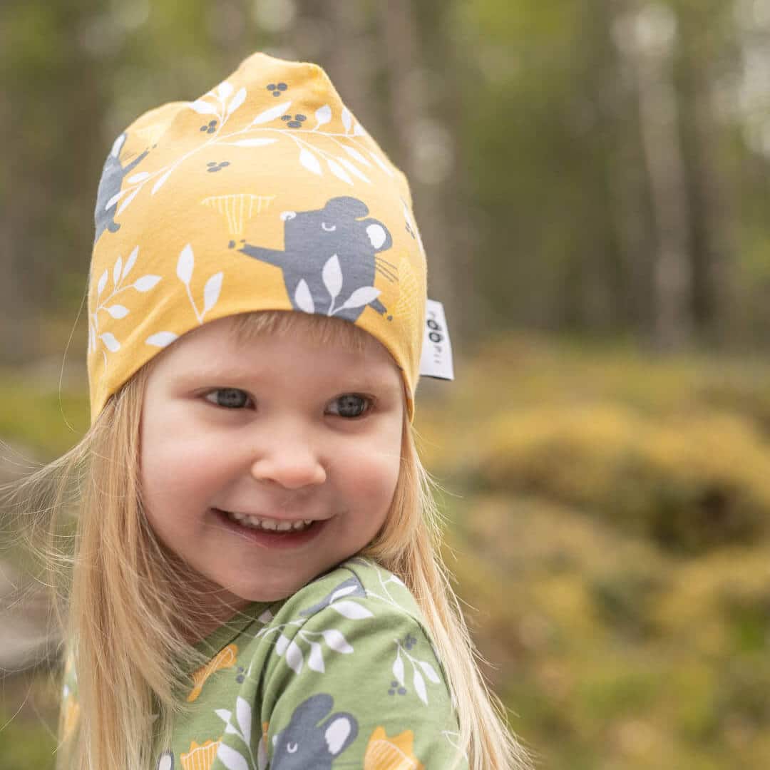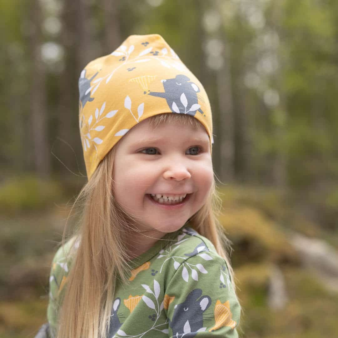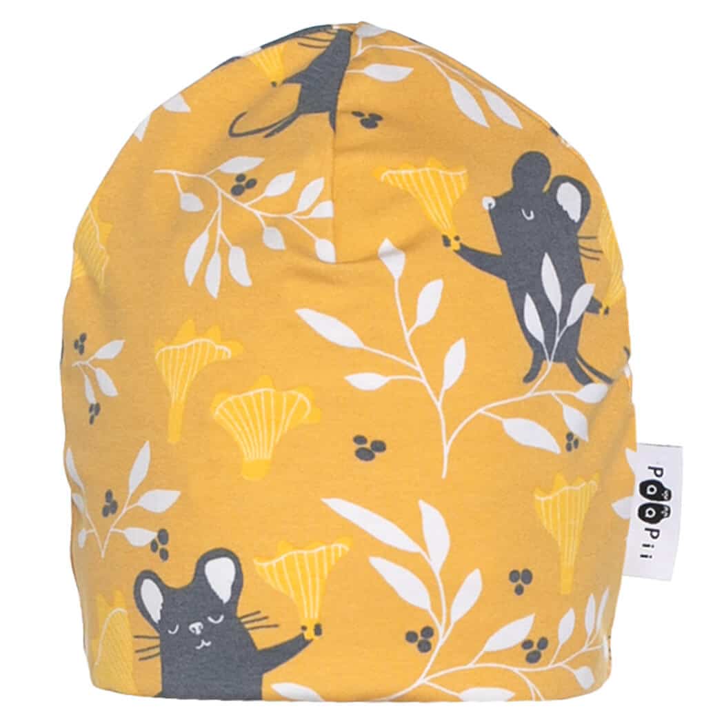 PaaPii Design Pipo Kantarelli neva-okra on aurinkoinen ja iloinen asuste. Pipossa olevat kantarellit paistattelevat pรคivรครค tummankeltaisella taustalla. Pipo on joustavaa trikookangasta ja se sopii loistavasti viileรคmpiinkin vรคlikausikeleihin.โ€ฏย