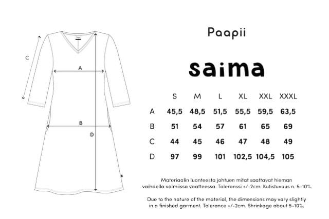 ”Minulle Saima mekko sujahtaa päälle monenlaisiin eri tilanteisiin. Se on riittävän pitkä ja siksi huoleton, kun ei tarvitse miettiä, että milloin vilahtaa. Saimassa on myös erityisen kivaa, että sen olemusta on niin helppo muunnella kengillä, jakuilla ja pikkuisilla asustemuutoksilla.”