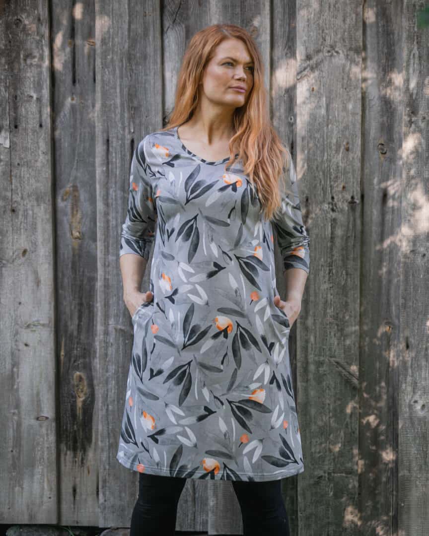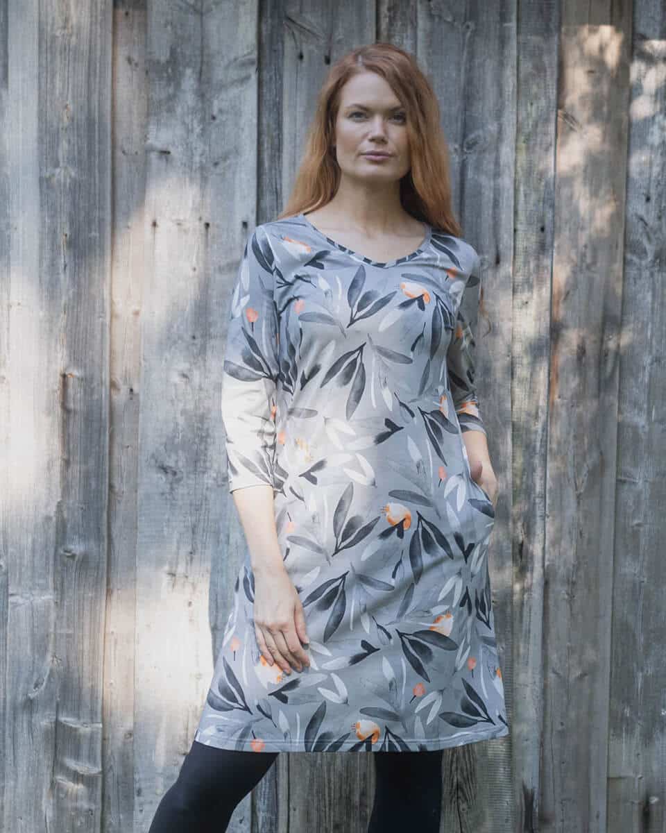 Laadukas digiprintattu luomupuuvillatrikoo on joustavaa ja ihanan pehmeää. Mekossa on takasauma joka tuo istuvuutta ja sivuilla kivat taskut.