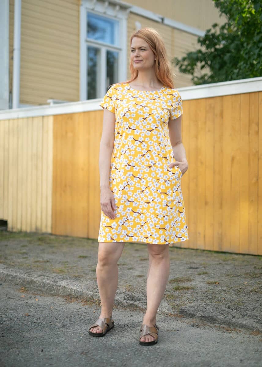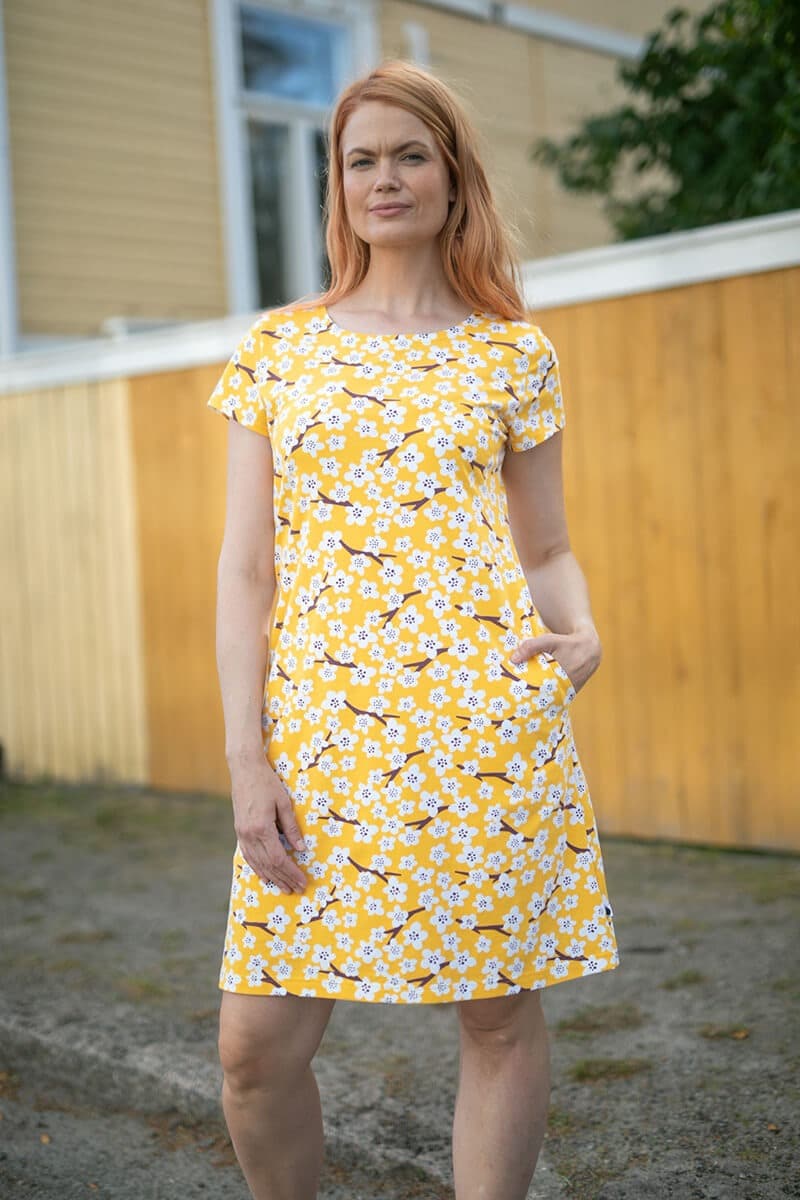 PaaPii Design Sointu mekko Kirsikankukka aurinko on raikas ja ihana mekko, johon on helppo sujahtaa. Yhdistรค siihen sandaalit ja olet valmis kesรคn rientoihin. Sointu mekon helma ulottuu suurin piirtein polviin saakka. Pรครคntiestรค ja hihansuista lรถytyy juhlavat kรครคnteet. Mekon selkรคpuolella kulkee sauma, joka takaa istuvuuden. Sivutaskut tekevรคt mekosta rennon. Tรคmรค vaate tekee kesรคstรคsi helpon. Tunnet askeleesi kepeรคksi ja olosi upeaksi!